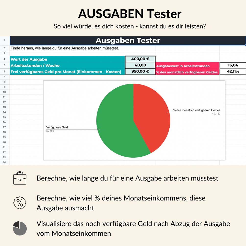 ✔️ AUSGABENTESTER - berechne wie lange du für eine Ausgabe arbeiten müsstest und wie viel % deines Einkommens das wären